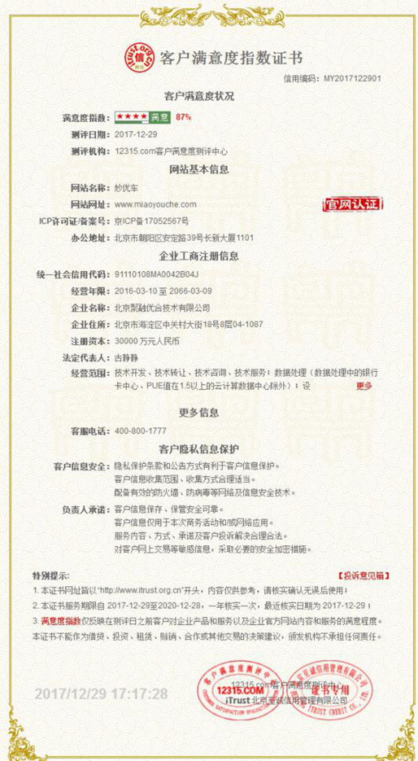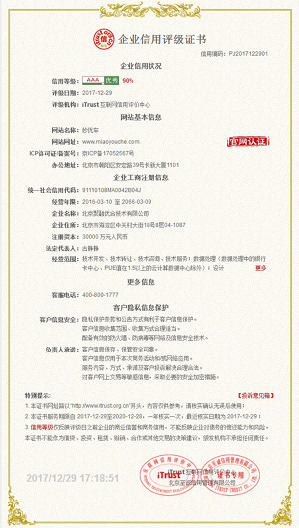 大河网讯 对互联网平台来说,信用安全是平台发展的首要基础,日前,国内权威的信用认证和测评机构iTrust互联网信用评价中心综合评审,妙优车获得网信认证企业信用AAA评级。妙优车的企业信用和用户服务受到了第三机构和客户的认可,这跟妙优车的努力分不开。