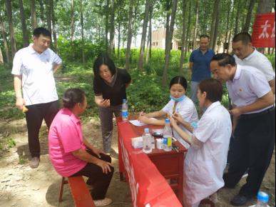 活动现场,太康县成人中专附属医院诊疗医生和帮扶人员在温庄行政村小树林布置诊台、摆放设备,展开对村民眼科和糖尿病专科的检查及病因咨询诊断,太康县质监局副局长司德军和村干部组织群众有序接受义诊。