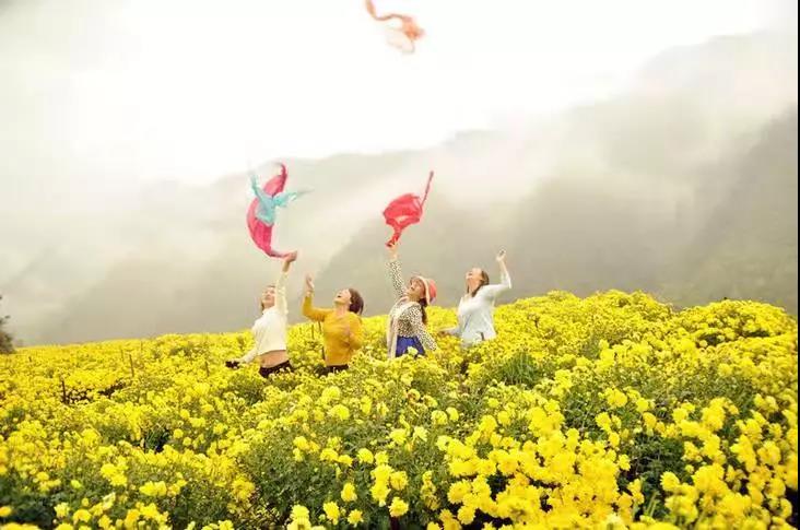 10月底,是菊花盛开的季节,山脚下一片片梯田里,延绵数十里,黄灿灿的菊花正次第开放,秋风吹过,一阵阵金色花浪如潮水般此起彼伏。远处秀丽的熊耳山上,红叶似锦,色彩斑斓,与山下花田遥相呼应。清澈的灌河水穿过枫林浸染的峡谷,流过层层金色花田,形成了唯美壮观的金秋奇景。