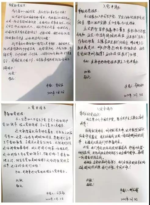 “加入这场战役,与全国的医护人员和党员干部一起战斗,我们深感自豪。”对于递交入党申请书的医护人员来说,加入中国共产党的夙愿由来已久。递交入党申请书时,她们告诉党组织,在这场防控战役中,尤其是在新闻上看到驰援武汉的党员医生护士在战场上吃苦耐劳、不怕牺牲,这样的精神深深打动了她们,更加坚定了她们加入到党组织的决心。