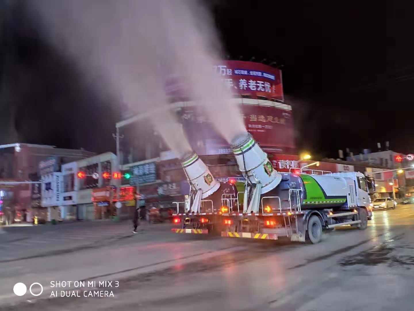 大河网讯 2月5晚9时许,在县城红绿灯路口,随着优美的音乐响起,几辆雾炮车开足马力,分别朝东西南北几个方向驶去。一路上,雾炮车“喷云吐雾”,开始对城区内37条主次干道、公园、广场等公共区域开展循环喷洒。