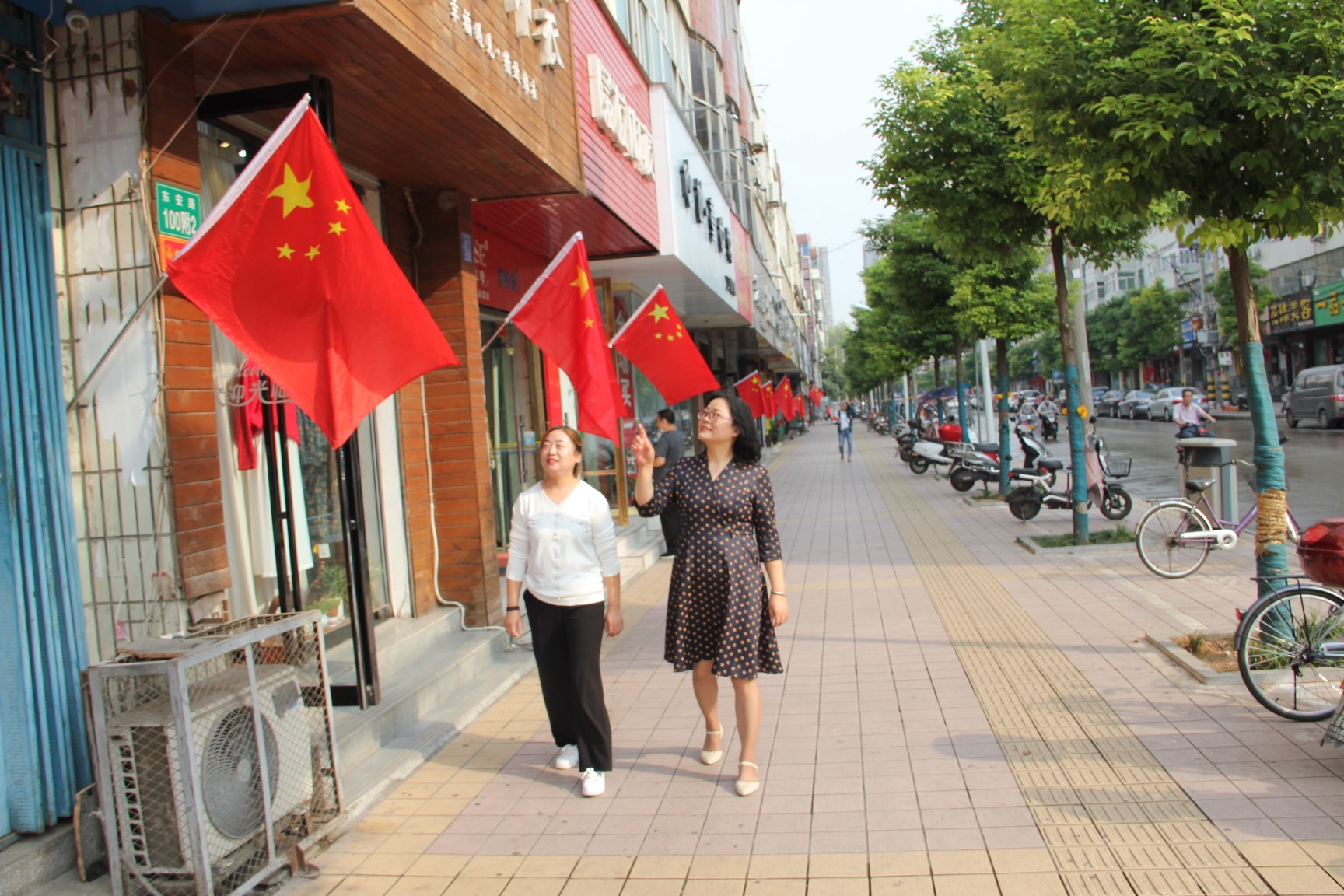 近日,平顶山市卫东区委组织部会同区城市管理局组织辖区商户,先后在该区建设路、优越路、东安路等沿街门店前插挂300余面五星红旗,成为一道亮丽的风景线,喜迎祖国七十一华诞。