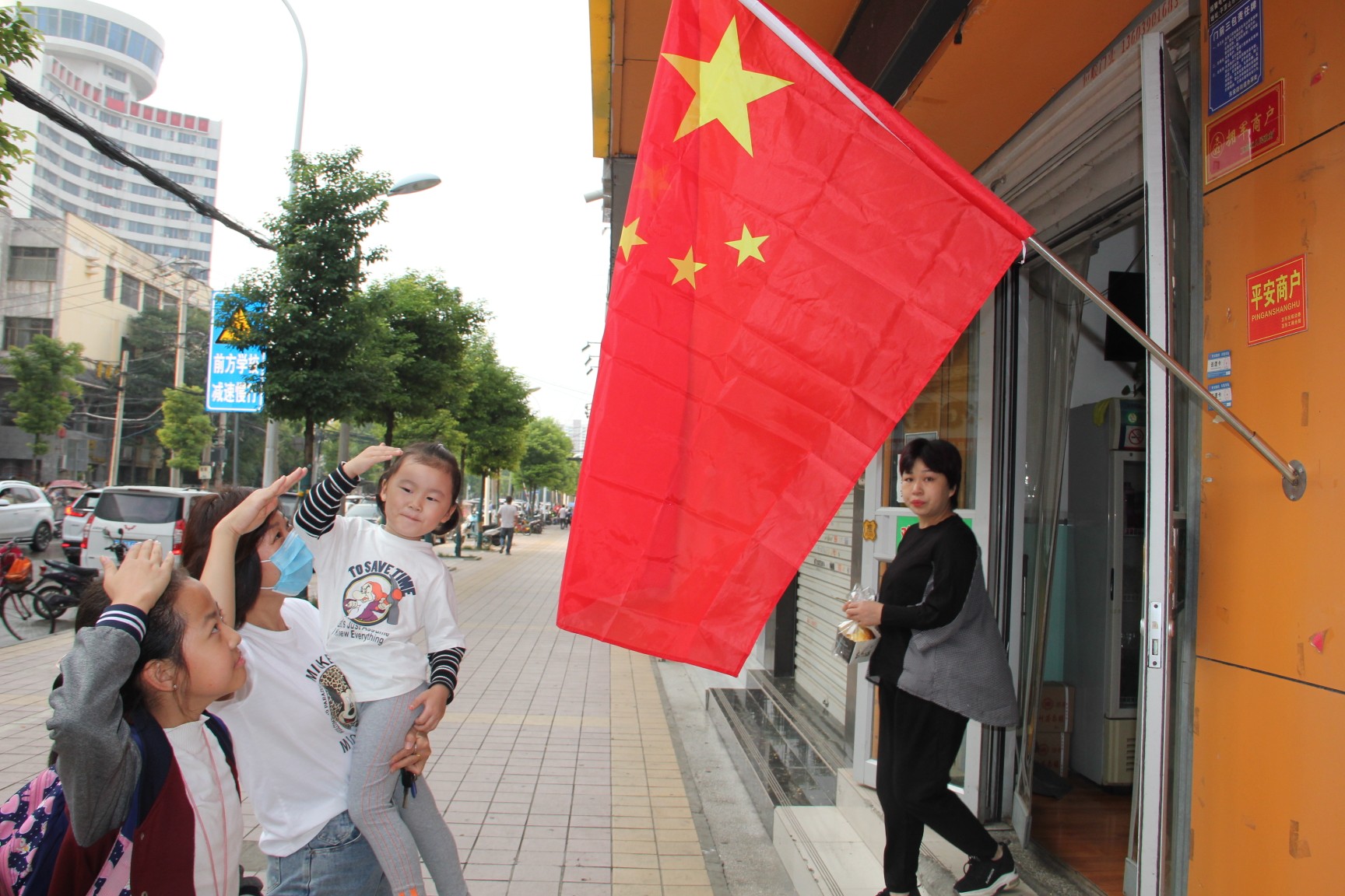 大河网讯(记者 蔡长伟 通讯员 古国凡 何洋)9月28日上午,平顶山市卫东区东安路两侧商户门前国旗飘扬,不少路过的家长和孩子们,及市民在观看国旗,并向国旗行注目礼。