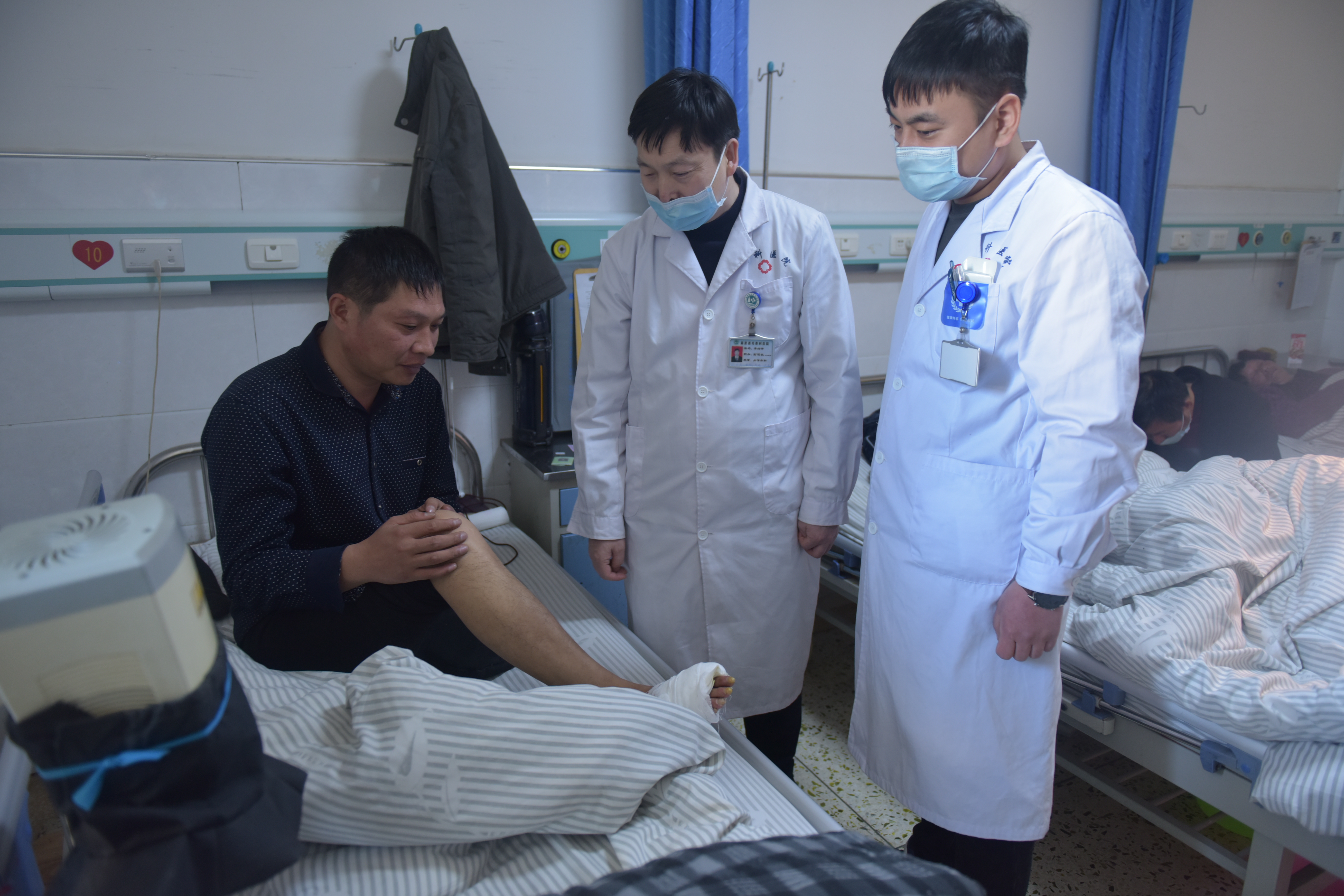 医者仁心,悬壶济世。刚入院时,闫静卫惧怕保肢治疗周期较长,花费较多,来院后强烈要求院方将患肢截除,以免后患。院长助理李俊甫得知这个消息后,立马将患者有关情况报告给了医院。院长李海伟知晓后,积极与闫静卫沟通,用通俗易懂的语言向他分析了截肢和保肢的利弊,还向他做出承诺,减免他住院期间的自费费用。有了这一针定心剂,闫静卫的心彻底地放进了肚子里。随后院长李海伟、手外科主任桑旭辉、医师杨艺飞、李俊良等专门成立了一个医疗小组,给闫静卫制定详细诊疗方案,经多次讨论,决定为他实施胫骨横向骨搬移手术。目前手术已成功结束,闫静卫患肢远端冰凉感、足趾末端麻木、疼痛症状消失,成功地保住了仅有的右下肢。