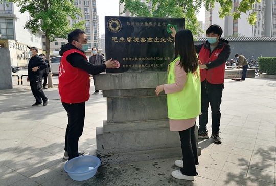 当天下午,金水路和玉凤路交叉口,车水马龙川流不息。党员志愿者们带上扫把、抹布、铲子等工具,来到“毛主席纪念亭”进行换“春装”行动。