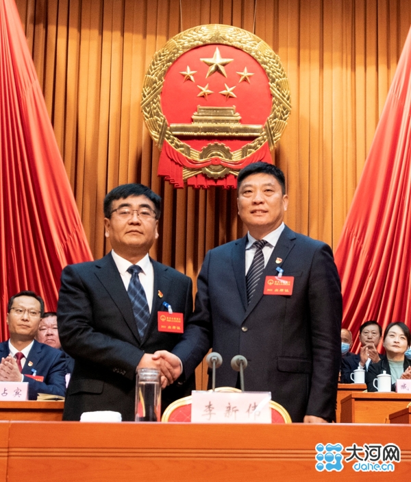 区委书记李新伟向新当选的郾城区区长李占宾表示祝贺