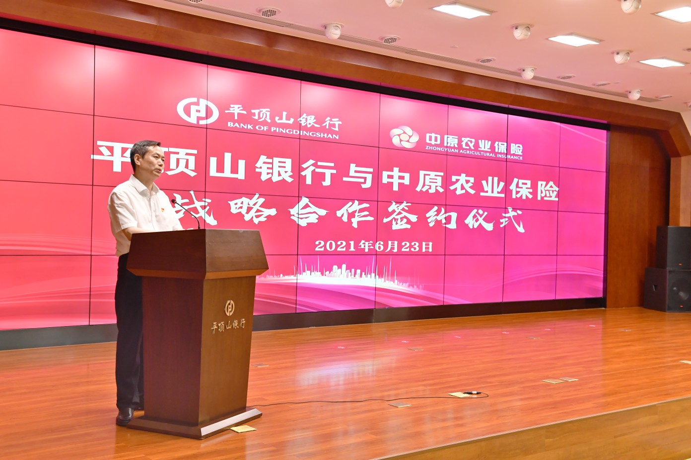 平顶山市常务副市长摆向阳和中原农险党委书记、董事长毕治军出席签约仪式并分别致辞。平顶山市金融工作局局长吕文卿、人民银行平顶山市中心支行行长李高建、市银保监分局局长杨建设以及市财政局、市农业农村局、市乡村振兴局有关领导同志应邀出席仪式。中原农险副总经理雷廷军及相关负责人同志出席仪式。平顶山银行党委书记、董事长高永华出席仪式并致辞,党委副书记、副董事长张俊普主持仪式,总行领导李艳生、李天雨、张豫晋、叶玲、崔琛及总行各部室负责人,营业管理部班子成员、部室负责人、支行行长参加签约仪式。