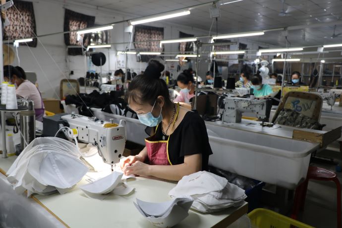 大河网讯 8月11日,在鲁山县张良镇张南村亨冠服饰有限公司,工人正井然有序、各司其职,在流水线上制作棒球帽。