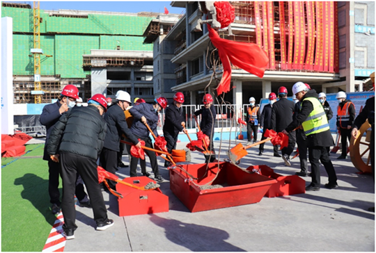 河南中医药大学第一附属医院党委书记翟剑波、中建八局河南区域总经理王自胜、郑州大学建设科技集团有限公司建达咨询副总经理李彪、河南中医药大学副校长苗明三、省卫生健康委副主任王成增分别代表建设方、监理方、施工方、卫健委发言。随后,参建单位领导共同推动封顶卷轴,为项目主体浇筑最后一方混凝土。