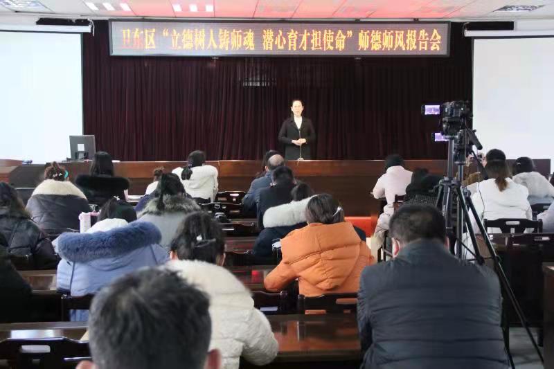 为扎实开展师德师风大学习大讨论大整治活动,大力展示广大教师爱岗敬业、无私奉献的感人事迹,让身边的好典型“活”起来,把身边的好典型“立”起来,努力形成人人学先进、后进赶先进、先进更先进的良好氛围。卫东区教体局在该区教师培训中心举行“立德树人铸师魂,潜心育才担使命”师德师风报告会。区教体局相关负责人以及区属各学校100多名校长、书记和教师代表等参加了报告会。