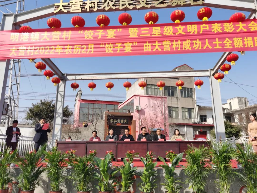 大河网讯 3月3日上午,信阳市平桥区明港镇大营村文化广场欢歌笑语,喜气洋洋,一场“饺子宴”暨三星级文明户表彰活动正在这里隆重举行。