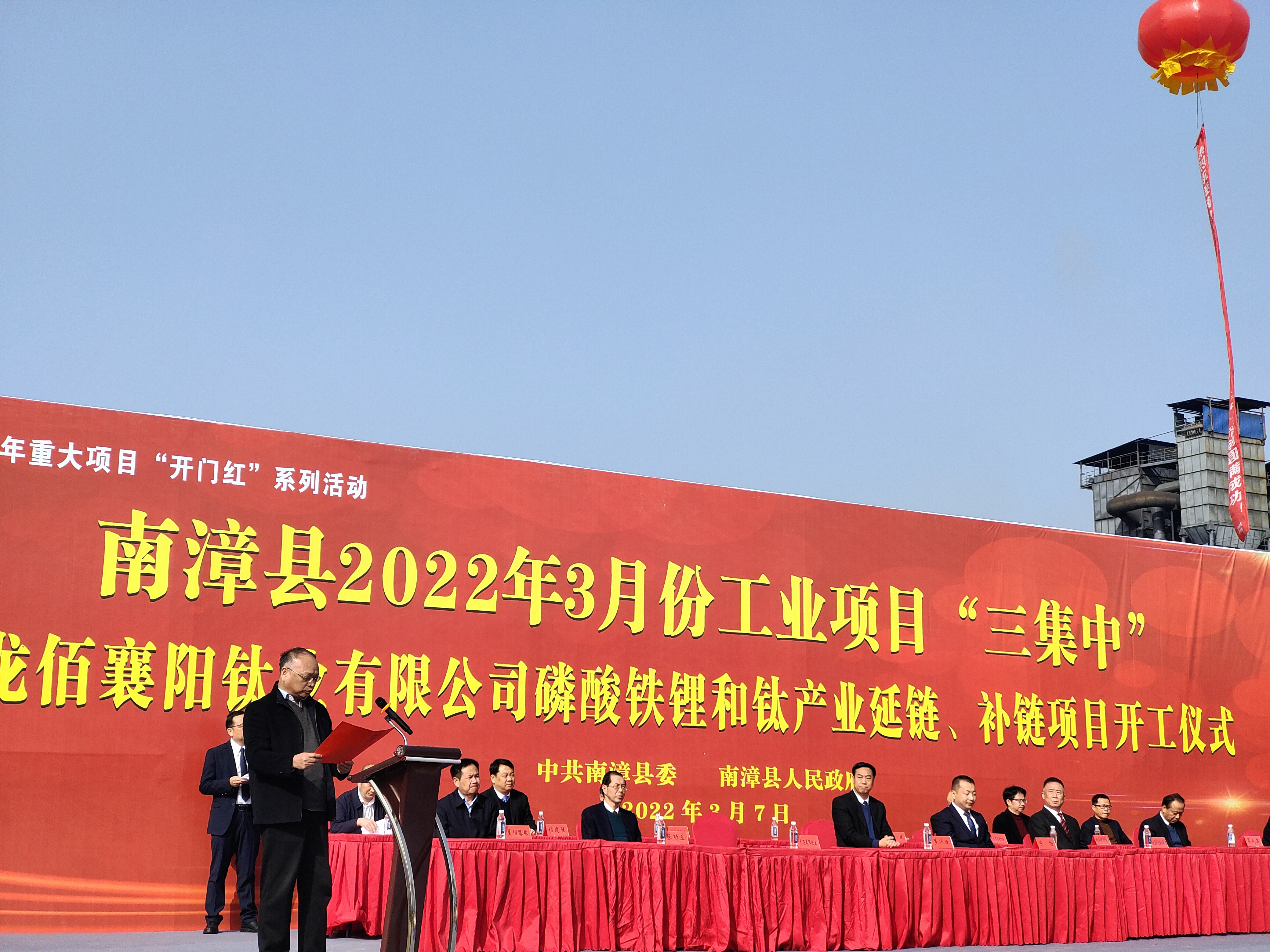 龙佰襄阳钛业有限公司总经理靳三良作为企业代表作了发言。他对项目的投资和发展前景作了简要介绍。龙佰集团坚持绿色低碳发展,构建循环产业集群目标定位,分别投资20亿元建设“年产15万吨电池级磷酸铁锂项目”和10亿元建设“年产20万吨金红石型钛白粉后处理项目”。项目建成投产后,年产值可达百亿元,实现利税20亿元,出口创汇3亿美元,新增就业800人,将大幅提高企业经济收益,吸收当地就业人员,促进地方经济高质量发展。南漳县委副书记、县长陈栋在致辞中说,此次举行的3月份工业项目三集中暨龙佰襄阳钛业磷酸铁锂和钛产业延链、补链项目开工仪式,表明了县委、县政府奋力夺取一季度工业经济“开门红”的信心、决心,对促进该县今年的工业发展具有重大意义。此举必将对南漳县优化产业结构,推动产业升级,构建产业生态,夺取“开门红”、再续“新精彩”产生深远影响,并提供强劲的项目支撑。
