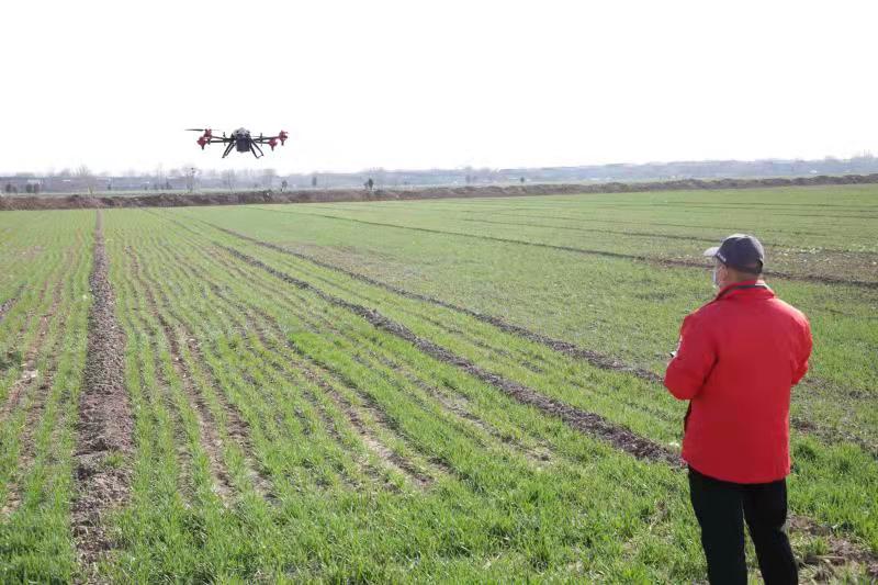 武陟县大虹桥乡岳马蓬村雨鑫农业科技公司工作人员利用无人机在麦田作业
