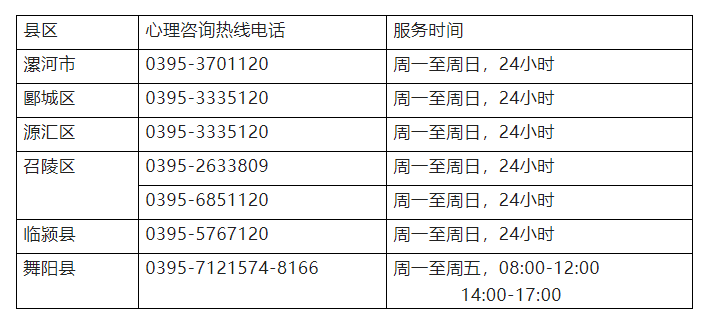 为营造良好的全民疫情防控氛围,全面加强疫情防控关键时期的公众心理建设,缓解疫情所带来的不良情绪和心理压力,经研究,漯河市和各县区均设立了疫情防控心理咨询热线,免费接受群众心理咨询,提供心理援助、心理疏导、心理介入治疗等服务。现将全市疫情防控心理咨询热线电话予以公布: