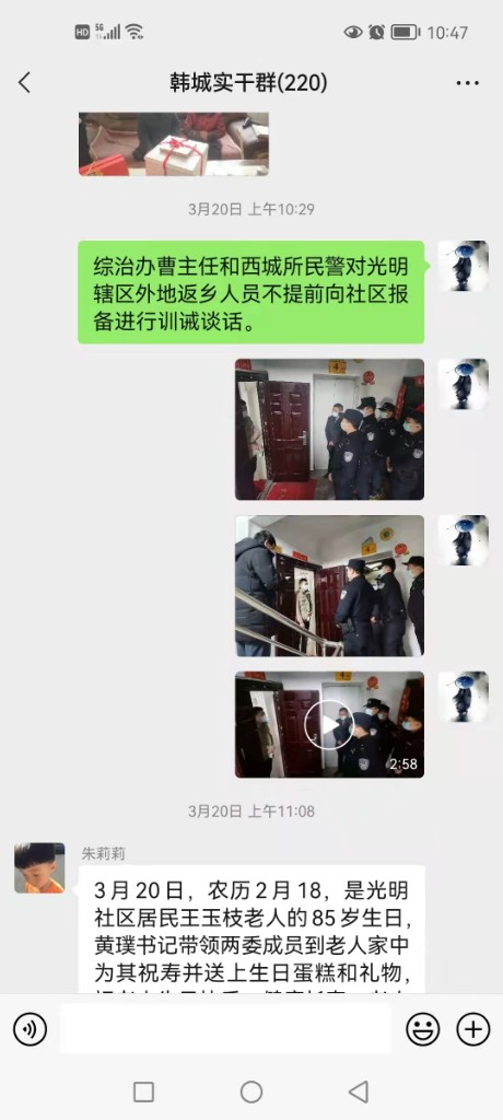 该街道班子成员带领口线机关干部,社区党员干部、志愿者等人员力量,连夜集中开展“敲门行动”。他们挨家挨户“敲门”,逐户登记、汇总家庭人员核酸采集预登记,同时全面排查摸清街道11个社区居民各种情况,确保不漏一户、不落一人、户清人准。通过“敲门行动”,共排查出省内已返人员238人,未返人员446人,拟返人员6人;省外已返人员207人,未返人员872人,拟返人员3人。对于已返乡人员根据疫情防控政策均已实施相应管控措施;对于未返乡人员及时联系,并逐人发“致韩城街道在外父老乡亲一封信”,劝其非必要不返乡,返乡提前3天报备。切实做到人数清、人头清、位置清、管控措施清,加强了辖区群众防疫意识。