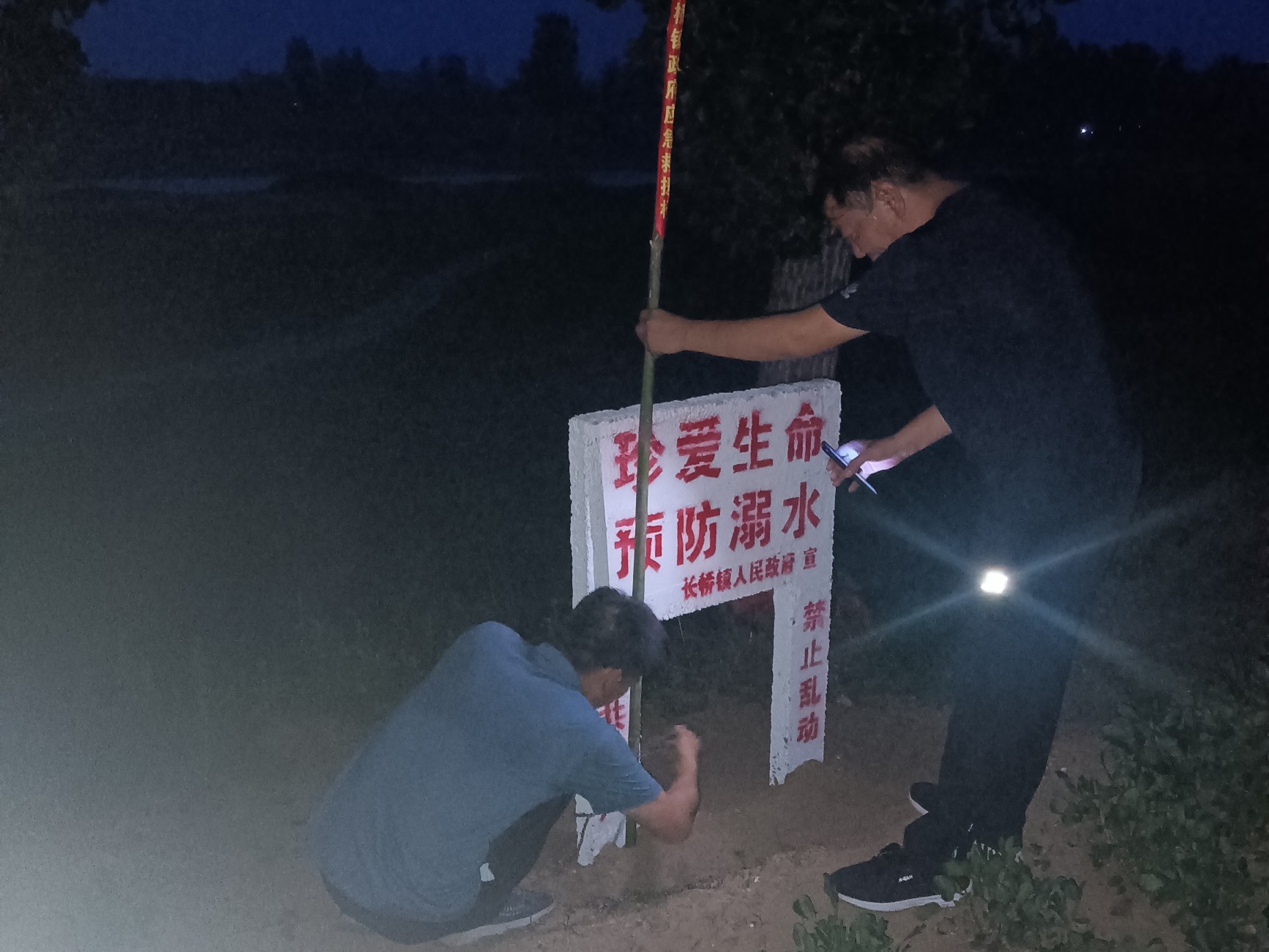 工作人员将自制防溺水救生杆放置河边备用