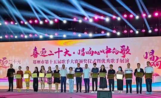 大河网讯 8月20日晚,“喜迎二十大·唱响心中的歌”郑州市第十五届歌手大赛颁奖仪式暨优秀歌手展演在中原区二砂文创园拉开帷幕!此次大赛由郑州市委宣传部、郑州市文化广电和旅游局、郑州市文学艺术界联合会主办;郑州文化馆、郑州市音乐家协会承办。