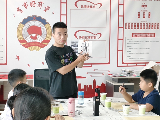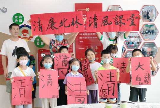 在书法老师的带领下,大家共同书写“清”字,聚精会神地临摹、仿写,表现出了浓厚的学习兴趣,传统毛笔书写让浓厚的人文气息慢慢洋溢开来。参加活动的学生家长说:“陪孩子身临其境学习书法的同时,又能学习到一些传统文化知识,增进了孩子对汉字书写的热爱,切切实实把崇廉尚洁的文化理念传达到了大家的心里。”