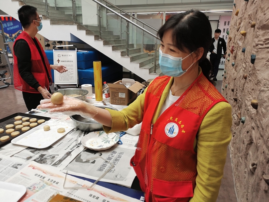 参与者在拿到原料后开始分工合作,和面、称重、压皮、包馅、按压,最后放进各种花纹的模具之中定型。每个人都按照流程,滚圆、压模、脱模,一个个大展身手忙得不亦乐乎。在一双双巧手的揉捏下,圆圆的月饼团呈现眼前,一会儿工夫就做了满满几大盘月饼。现场热火朝天,一张张绽放的笑脸,一块块香甜的月饼,处处流露着收获的喜悦。