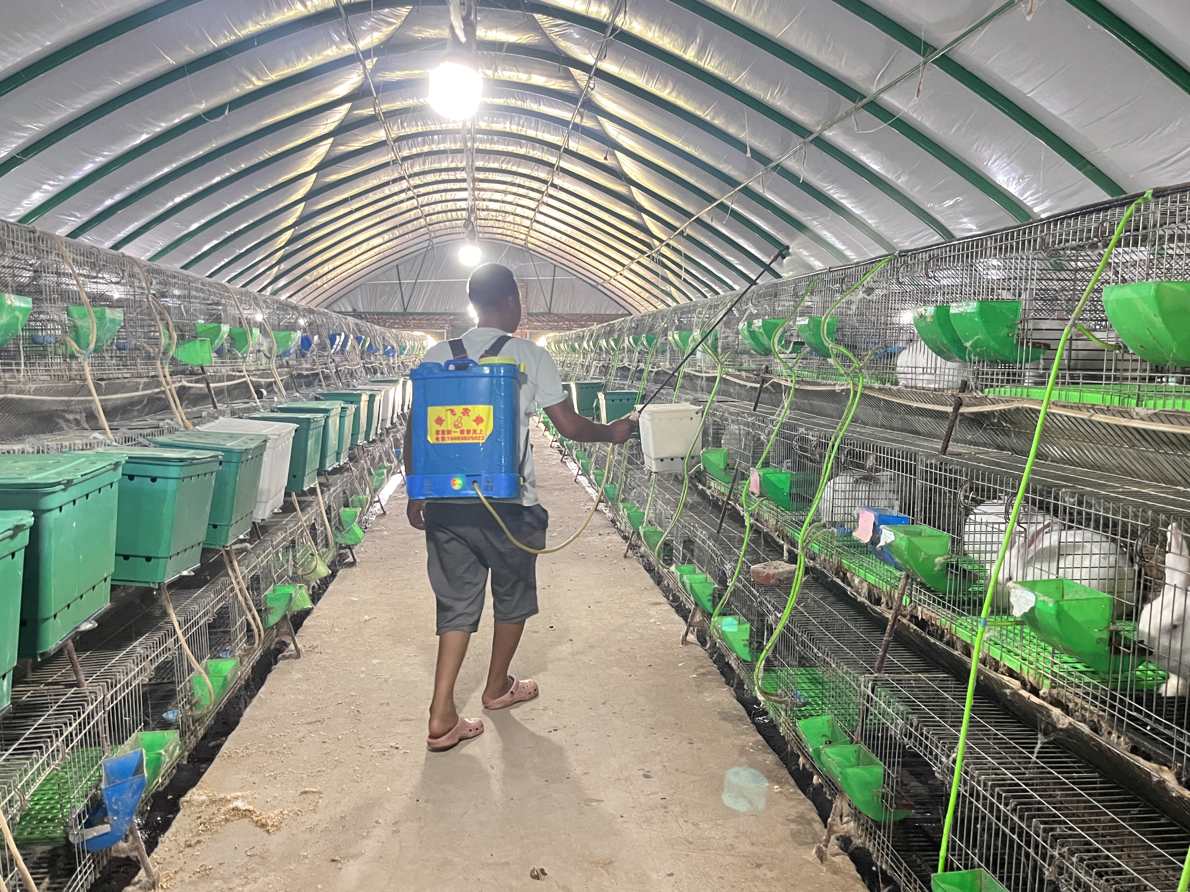 大河网讯 9月4日上午,开封市祥符区朱仙镇老饭店村的脱贫户朱冬五,正在自家的兔棚内打扫卫生,背着药箱仔细消毒,只见他一瘸一拐地打理着兔棚,但动作娴熟,不一会儿,整个兔棚就被他打扫得干干净净。