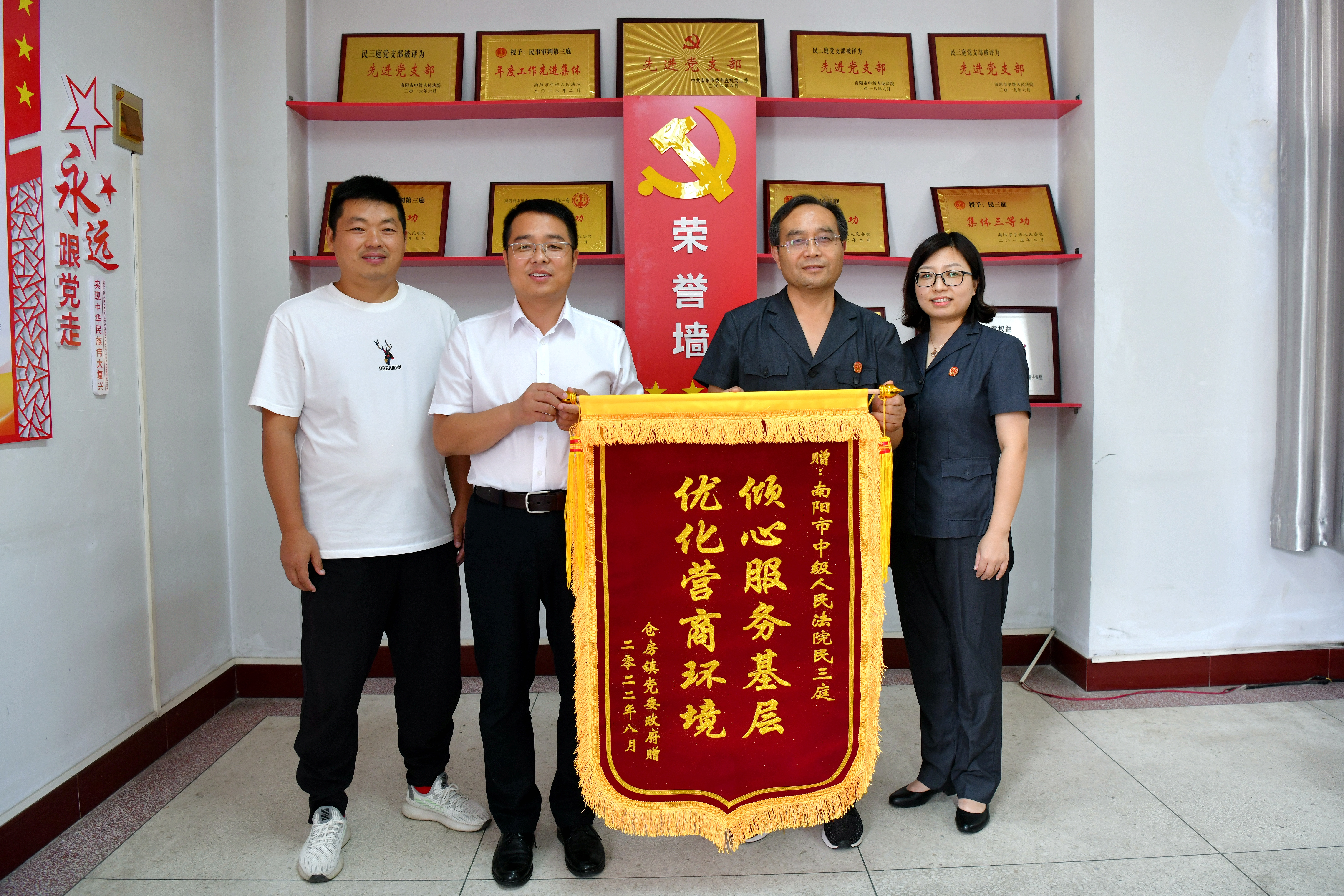 大河网讯 “民三庭的法官们及时为我们排忧解难,破除了开发过程中的堵点和法律难题,真是太感谢你们了!”9月7日上午,淅川县副县长、仓房镇党委书记杨阳将一封感谢信和一面锦旗,送到了南阳市中级人民法院民三庭庭长卢国伟手中。锦旗上印着“优化营商环境 倾心服务基层”的语句,表达了对南阳中院民三庭工作的肯定和感谢之情。
