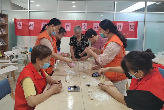 在未来路街道新时代文明实践所,街道党群服务中心联合社工站组织的“中秋月儿圆 党群共团圆”活动现场一派浓浓的节日气氛,在党群工作人员的指导下,大家兴致盎然地开始制作月饼,搓面团、搓馅料、压模印……大家有条不紊地进行着各种制作程序,相互交流着各自的制作方法和技巧。不一会儿,一个个精致的月饼就“诞生”了,看着自己亲手做出来的月饼,大家脸上洋溢着幸福、满足的笑容。
