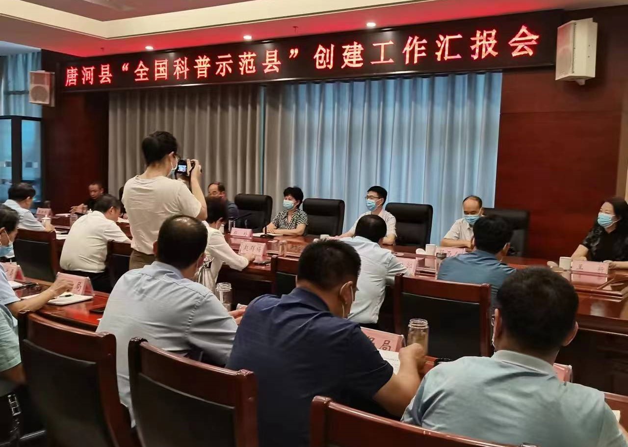 在召开的汇报会上,唐河县委书记贺迎、县人大常委会副主任周全正、县政府副县长陈华义、县政协副主席赵群梅等四大班子的领导及县创建工作领导小组成员单位主要负责人员参加了会议。县委书记贺迎致辞,县政府副县长陈华义代表唐河县汇报了创建全国科普示范县工作情况。