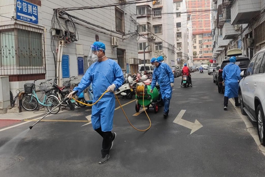 王国印既是小区的老物业经理又是小区业主,他与业主志愿者余进江、黄勋甫、李士水一起负责小区的垃圾清运和环境消杀,每天他们推着消毒液水罐车,拖着长长的水管,手握喷枪穿梭在小区的楼宇之际,对每栋楼、每个单元、每一层楼进行细致的喷洒消毒。