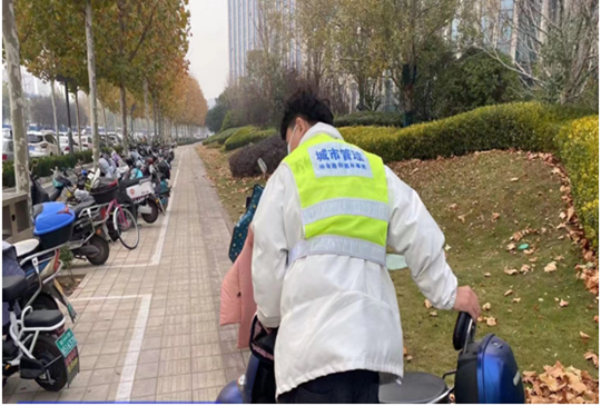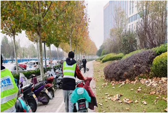 “您好,这里不能停电动车,请停在非机动车停车线内,谢谢!”在行动过程中,城市管理协管员来到辖区各重点路段、主要路口,把乱停乱放的非机动车停放到划定的停车区域,确保沿街非机动车辆做到摆放整齐有序、朝向一致。同时,通过劝导和教育的方式,对非机动车车主进行文明劝导,引导广大群众文明出行、规范停车,自觉做文明交通的践行者和守护者。