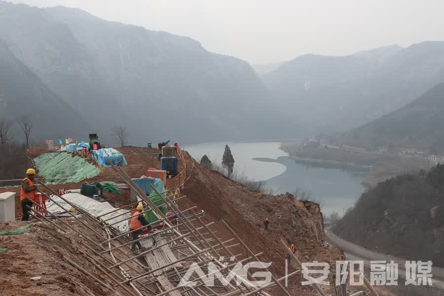 山谷间,一道宽阔的水面如碧玉般铺开,向太行山深处延伸,那就是弓上水库。水库北侧的山崖上,数台机械和数十名工人正在酣战。