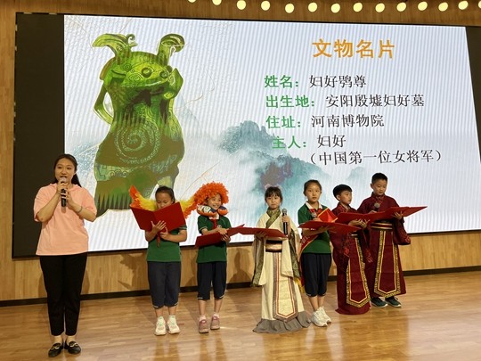 经过老师的娓娓道来,孩子们不仅了解到河南博物院的功能、要素、收藏,学习国宝文物背后的冷知识,还着重认识河南博物院镇馆之宝之一的文物——妇好鸮尊,通过图像了解文物背后的故事。现场还以“文物剧本杀”文物故事演绎的方式,创设情境,寓教于乐,从孩子的视角出发,用童趣的想象力讲述文物背后的故事,并制作自己独有的文物名片。