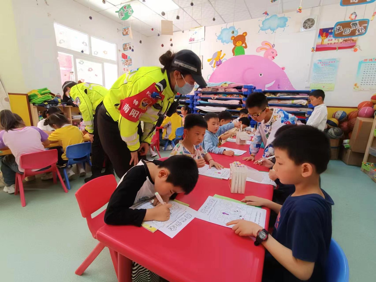 活动中,民警们采取场景模拟、趣味问答、交通安全画图填色等方式与同学们进行沟通互动,通过通俗易懂的方式向同学们传授交通安全知识、介绍各种交通信号标志。同时,向同学们强调遵守交通规则的重要性,以及在人行横道打闹、进入或横穿马路等危险行为的危害性,以寓教于乐、生动形象的教育方法向同学们传授了日常的交通安全知识。