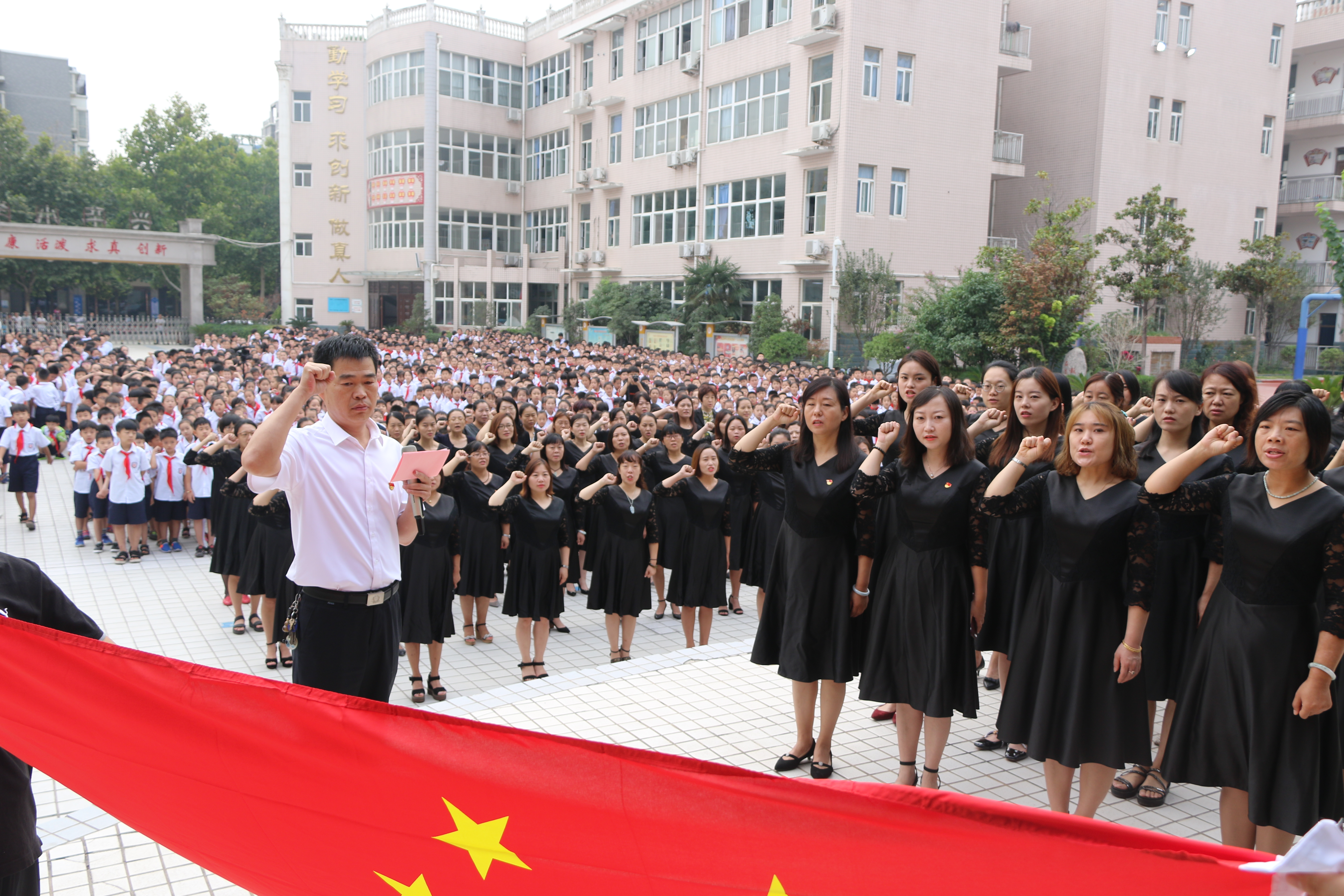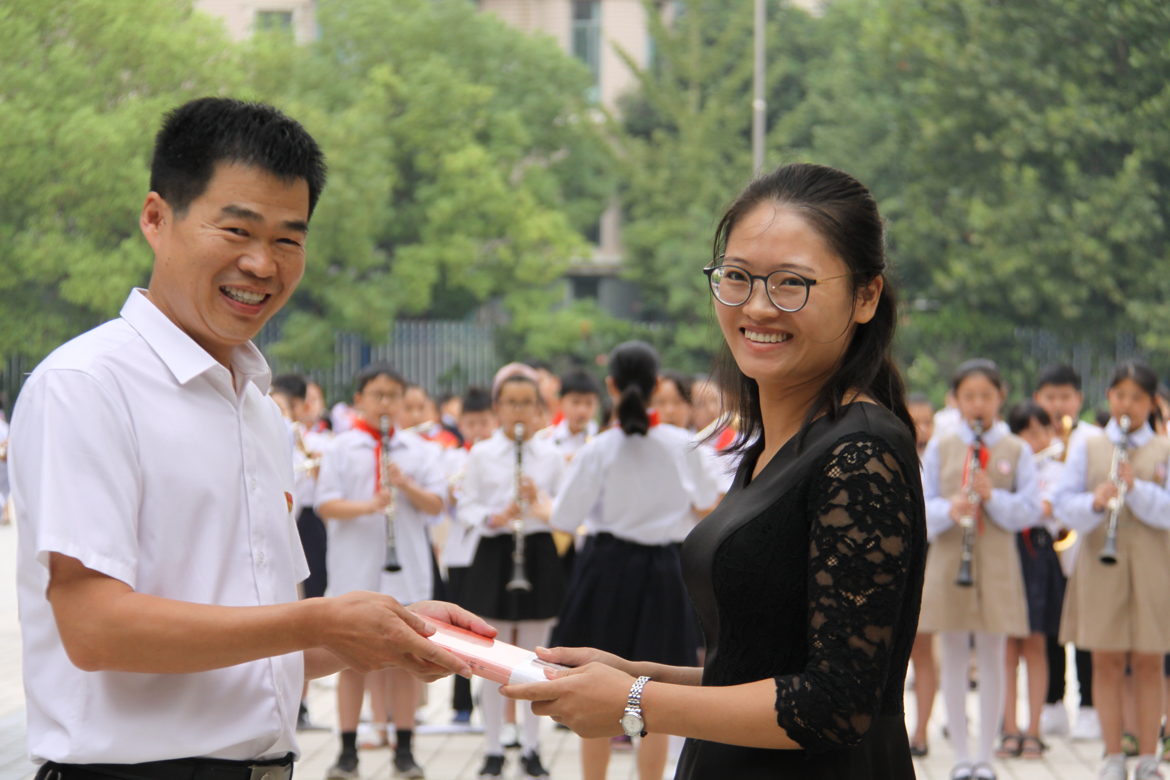 周一早上老师们进入校门时,专门安排礼仪生齐声祝福:“祝老师,节日快乐!”校长贾勇为每位老师送上一本书,并写上祝福寄语,鼓励老师们勤学习多读书。学校还举行了教师节主题升旗仪式,仪式上,少先队员为全体老师送上节日献词;全体教师面向国旗进行宣誓,争做“四有”好老师,弘扬高尚师德;最后,全体学生向老师们献上少先队员最崇高的敬礼,并祝老师们节日快乐!(楚智强 郑浩)