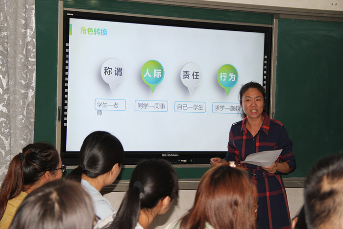 伏牛路小学副校长姜南进行了新教师职业定位教育。姜南从"角色转换"和"职业认同"两个方面带领大家认识自己的职业和角色,明确教师这个职业所担负的社会责任。