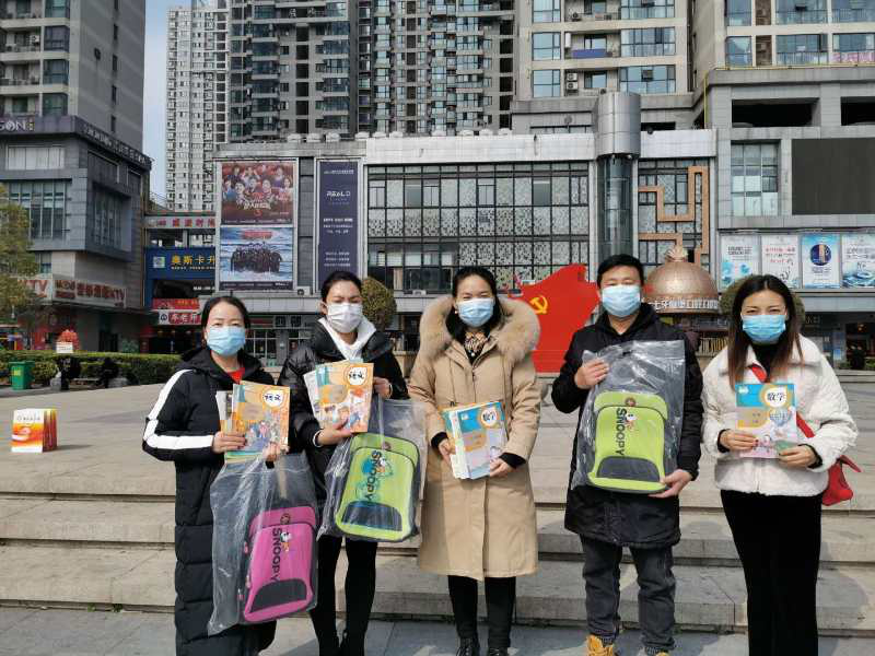 幸福路小学志愿者小组在校长胡建玲带领下走访一线医务人员家庭。他们在保证自身健康的前提下,先行和家长进行沟通,征得同意后亲手把为孩子们准备的新课本,精心挑选的新书包送上门,为孩子和家庭带去了祝福。