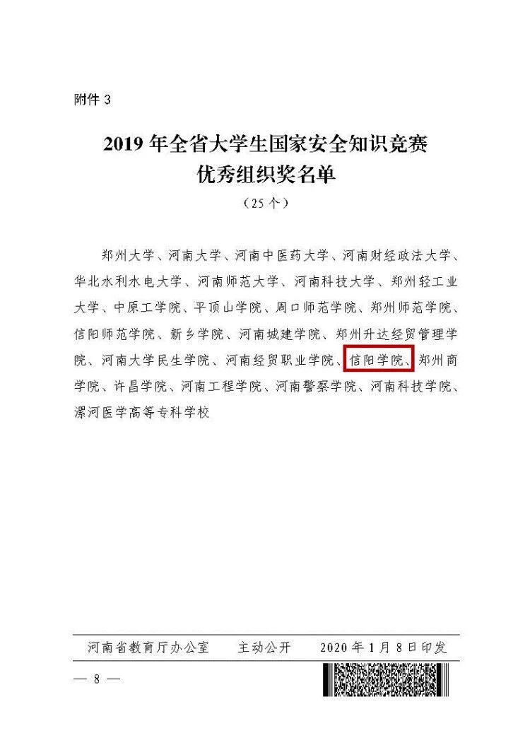 大河网讯 4月15日,记者从信阳学院获悉,该校在河南省委高校工委、省教育厅近日下发的《关于2019年全省大学生国家安全知识竞赛情况的通报》中,获2019年全省大学生国家安全知识竞赛“优秀组织奖”。