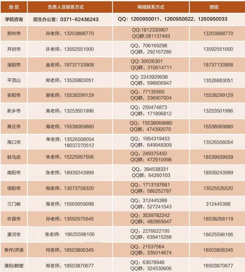 郑州升达经贸管理学院在河南省各地区招生联系方式: