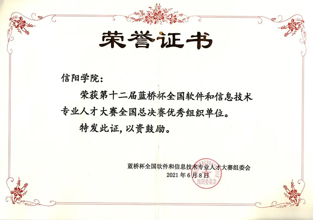 大河网讯 9月28日,记者从信阳学院获悉,在第十二届“蓝桥杯”全国软件和信息技术专业人才大赛中,该校大数据与人工智能学院获全国总决赛优秀奖2项,河南省赛区一等奖2项、二等奖1项和三等奖2项,优秀指导教师奖3项。同时,学校荣获全国总决赛优秀组织单位。
