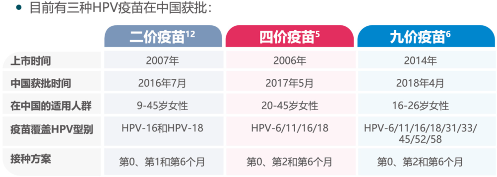 不同的HPV疫苗所适用的人群也各不相同,所含的型别也不一样,二价、四价、九价也代表了所含型别的个数,具体如下图所示: