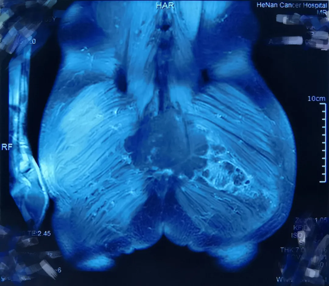 △上图可见左右侧臀大肌均受肿瘤侵犯、范围很大