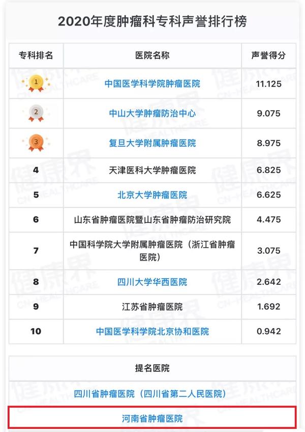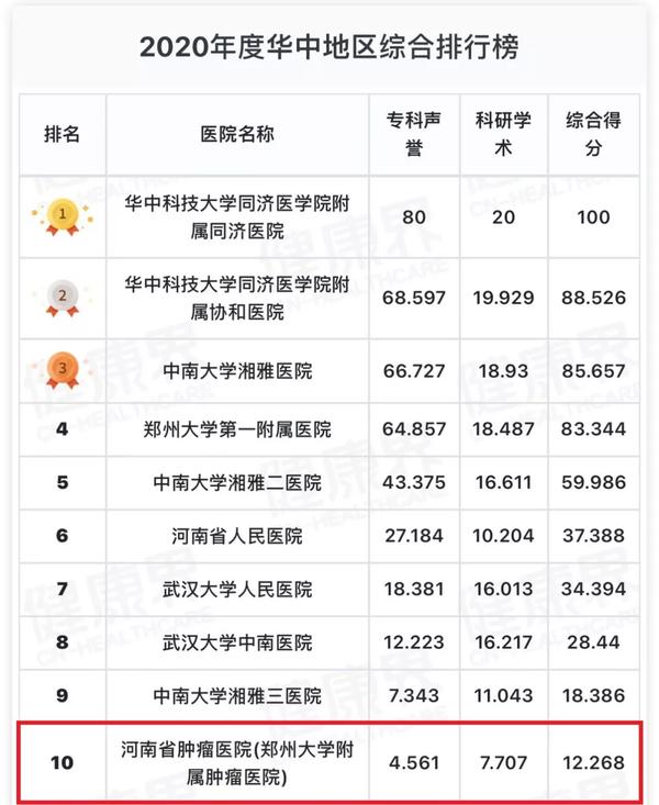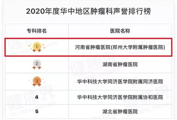 在华中地区肿瘤科声誉排行榜中,河南省肿瘤医院连续3年第一;华中地区医院综合实力排名第十,是华中区唯一一家跻身前十的专科医院,全国肿瘤科声誉排名第12位。