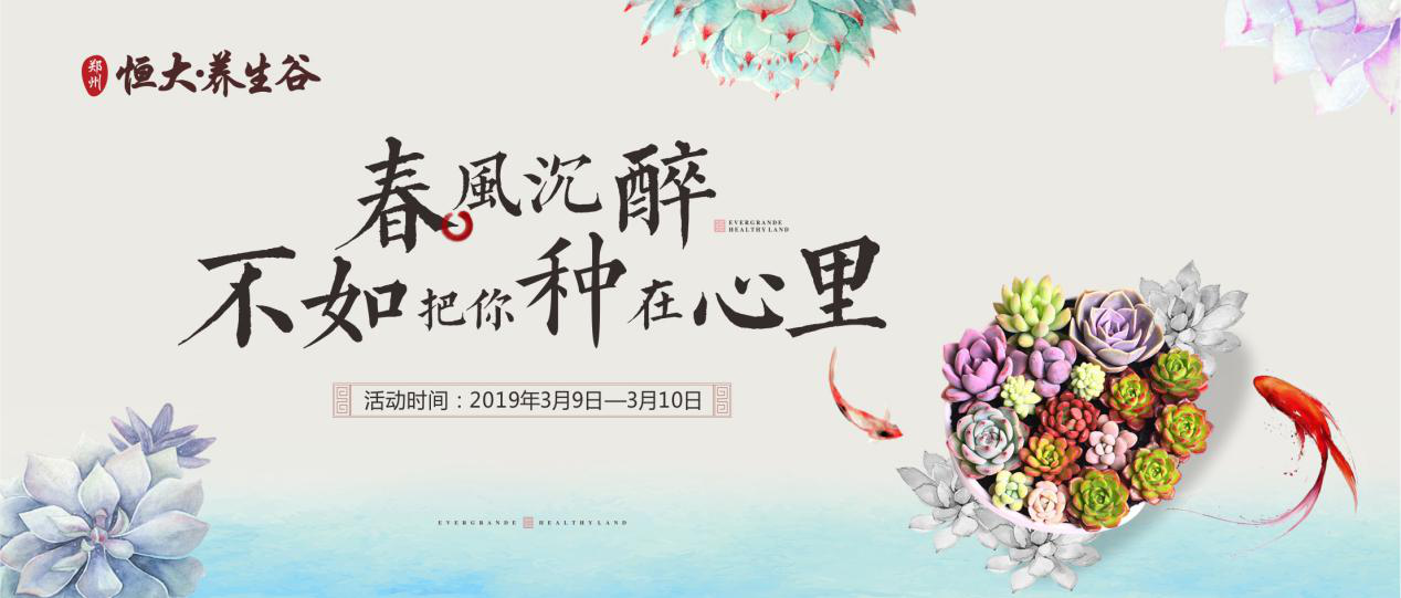 3月9日-10日,【郑州恒大·养生谷】“春风沉醉,不如把你种在我心里”邀您共同悠享好春光。多肉植物、手绘环保袋、创意花盆蛋糕等精彩活动,等您一起亲手创造安然春意,耕耘生活的春天。