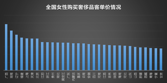 不同年龄层的女性在奢侈品消费中也有着鲜明的特色,在购买奢侈品的女性中,56岁以上的成熟女性购买奢侈品的客单价排名第一,与90后的女性相比其客单价要高出32%。从全国范围来看广西女生对自己出手最大方,购买奢侈品的客单价全国排名第一,其次是湖南、辽宁、福建和上海。