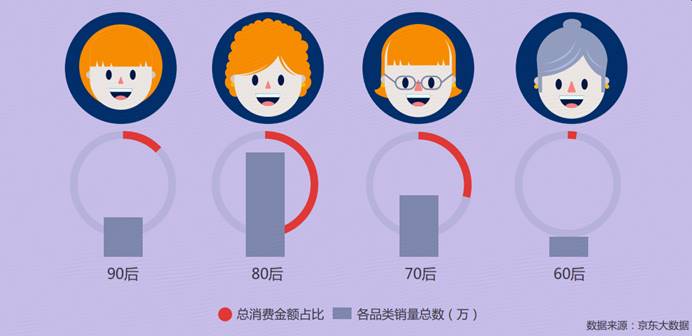 京东大数据显示,近年来,女性消费者确实显示出越来越强大的购买力,在每年倍增的女性购物大军中,80后以接近50%的总消费金额占比荣登京东女性最大贡献群体,其次是70后和90后。不同年龄的消费者的购物偏好也有不同,90后女性最爱买的是美妆个护,随着年龄的增长,女性的消费偏好也从自身逐渐转向了家庭,从美妆个护转向了食品生鲜。