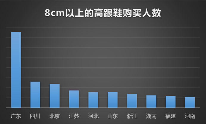另外,高跟鞋也是女性“美丽消费”的重要商品之一。整体来看,南方地区女性更爱买高跟鞋,在购买8cm以上高跟鞋的女生中,排名前十的地区里南方地区占比达60%,其中广东排名第一,其次是四川、北京、江苏、河北,河南位居第十。