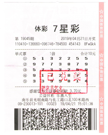4月21日晚,七星彩第19045期开奖,开奖号码为9773879。当期全国中出的1注头奖被我省濮阳购彩者擒获,奖金500万元。中奖彩票出自濮阳南乐县光明南路与化工路交叉口北100米路西的4109230013体彩网点,为一张10元5注单式票。