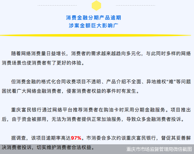 在各类场景贷中,富民银行与享车平台的“加油贷”风波曾掀起市场广泛关注。从今年最新情况来看,重庆日前发布2020年消费维权热点事件并“点名”富民银行。近日重庆市市场监督管理局官微消息显示,重庆富民银行通过网络平台推荐消费者在购油卡时采用分期金融服务。项目推出后,由于资金被挪用,无法为消费者提供正常加油服务,导致众多金融消费者投诉。据调查,该项目逾期率高达97%。重庆市消委会多次约谈重庆富民银行,督促其妥善解决消费者投诉,切实维护消费者合法权益。