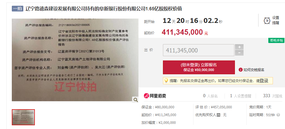 阜新银行1.65亿股股权被拍卖:4.11亿元起拍 300多人围观