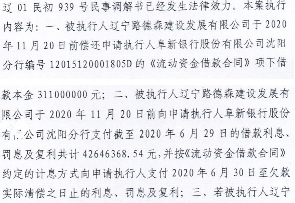 执行裁定书显示,路德森应于2020年11月20日前偿还阜新银行沈阳分行的借款3.11亿元,以及截至2020年6月29日的借款利息、罚息及复利共计4000余万元和其他应还款项。但辽宁路德森未能在规定时间内履行相关义务,因此其持有的1.65亿股股权被处以拍卖、变卖的决定。