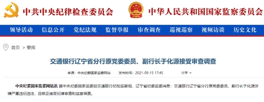 交通银行辽宁省分行原副行长于化源因涉嫌严重违纪违法被查